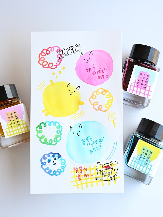 「書く、塗る、混ぜる」。 自由な発想で楽しめる、ネオン&ポップカラーの新色を発売します インクのテーマは 「あこがれのくるくるキャンデー」 子供の頃、ずっと憧れていた、あの大きなくるくるキャンデー。 クレヨンや色鉛筆では表現できない、飴の中に練り込まれた特別な色合い。 「なめてもなめてもなくならない」甘い夢のような時間を、インクに閉じ込めました。 ラインナップ: • くるくるブルー • くるくるピンク • くるくるイエロー 大きなくるくるキャンデーを見た時の、 あの特別なワクワク感。 このインクを手に取ったとき、あの日のときめきをちょっと思い出して、あなたの時間を少しだけ楽しく彩れますように。 染料:30ml