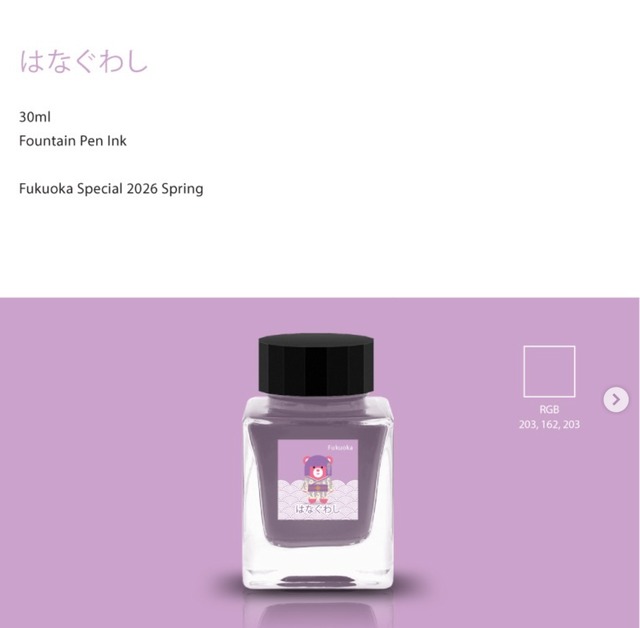 2026年宇宙遊泳 福岡開催記念インク 福岡県各地で見られる藤をモチーフにしたカラー 青と赤が織りなすせめぎ合いをお楽しみください 「はなぐわし」は、古語で「花が美しい」や「素晴らしい」という意味を持つ言葉で、特に「桜」や「葦」にかかる枕詞として『万葉集』や『日本書紀』などで使用されてきました。 漢字では「花細し」や「花細」と表記され、古くから親しまれた形容詞的な表現です 福岡の太宰府には万葉集筑紫歌壇の歌碑がたくさんあります。 染料:30ml