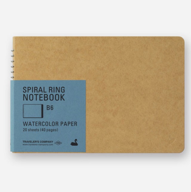 水に強く発色の良い水彩用の紙を使用したノートです。 アニメの背景画などにも使われている少し厚めの水彩紙は、 水彩はもちろん、鉛筆やペンでのスケッチや、写真やチケットなどのコラージュにもおすすめです。 シンプルでナチュラルな質感の表紙は、樹脂を含んでいて丈夫な含浸紙を使用。さりげなく、水彩紙の真っ白な紙面をイメージした白鳥のアイコンが刻印されています。 小さなスケッチブックのような<B6>は、カフェのテーブルで広げて描くのにちょうど良いサイズです。 【HANDBOUND】 スパイラルリングノートは、1冊ずつ手作業でリングを綴じて作られています。 <パッケージ内容> 中紙/無罫 20枚(40ページ)、スパイラルリング製本(銀色) 素材:含浸紙、水彩紙 サイズ:本体/H130×W193×D18mm MADE IN JAPAN
