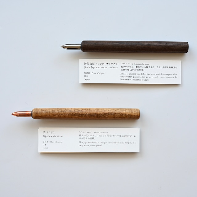 Kakimori | Handcrafted nib holder 作家・河村寿昌氏による手作りのつけペン軸。 数ある木のコレクションの中から1本ずつ丁寧に削り出し、制作。 木は世界各国から長年に渡り集めた珍しい種類のものばかり。 弊店には2種類届いています。 ・神代山桜(じんだいやまざくら) 地中や水中に、数百年から数千年という長い年月を無酸素の状態で埋もれて いた樹種。 ・栗(くり) 縄文時代にはすでに柱として採用されていたと言われている日本原産の樹種 ソケットはカキモリオリジナルのものを採用。耐久性に優れ、カキモリのペン先の他にも、多くのブランドのものに互換性があります。 お好みのペン先と組み合わせてお楽しみください。 互換表 chrome-extension://efaidnbmnnnibpcajpcglclefindmkaj/https://cdn.shopify.com/s/files/1/0405/6150/8515/files/Kakimori_Nib_holder.pdf?v=1756349298 ◾️作家 河村寿昌 愛知県一宮市を拠点に制作を行う木工作家。国内外の貴重な木材を収集し、木工ろくろを使って文房具をはじめとする様々なアイテムの制作を行なっています。 サイズ H111 x Ø11mm 重量 約7g 素材 ボディ:木、ソケット:プラスチック 製造(人) 本体:河村寿昌 ソケット:佐久間特殊鋼株式会社/有限会社古田化成 製造(国) 日本 ・