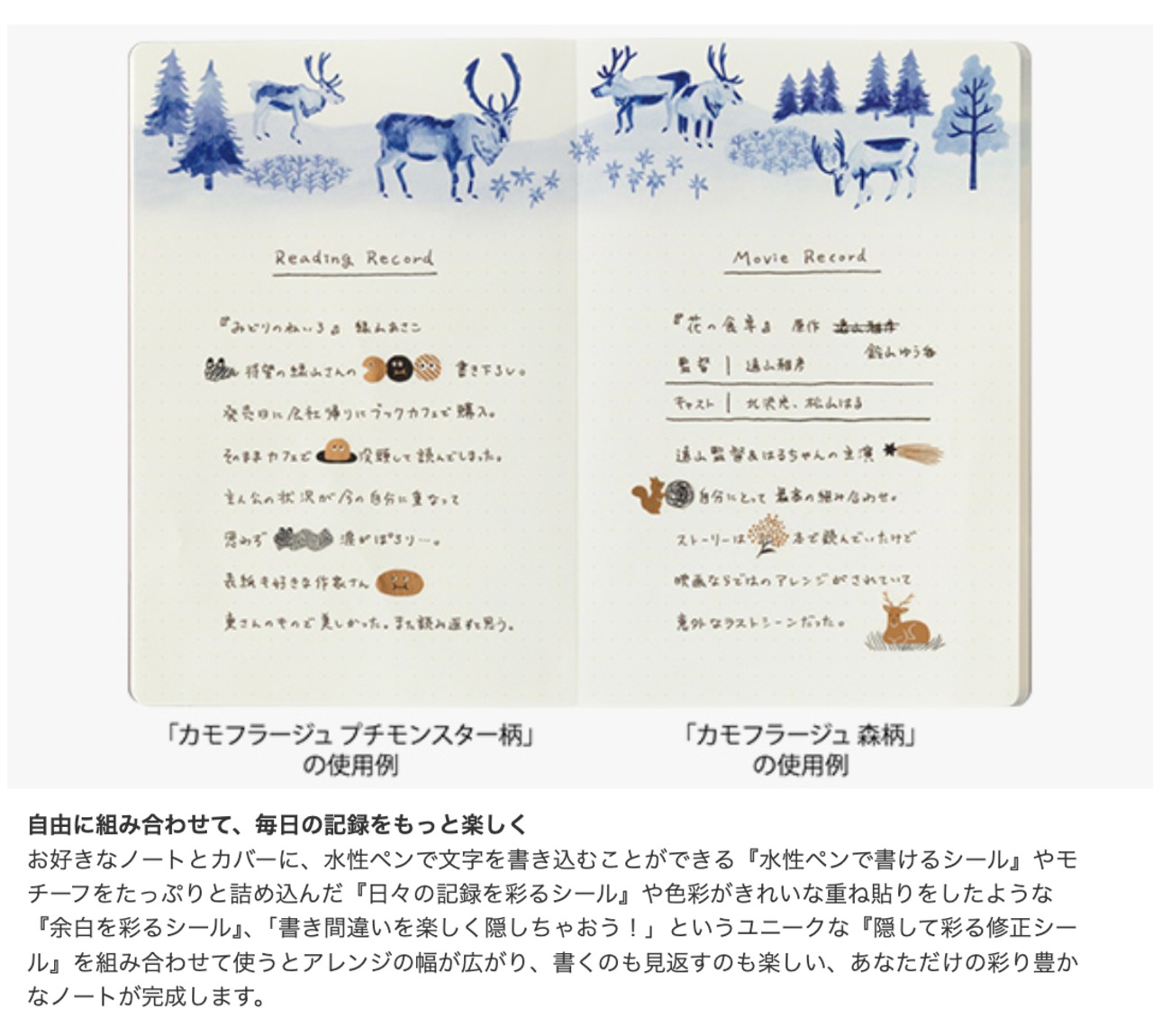お好きなノートとカバーに、水性ペンで文字を書き込むことができる『水性ペンで書けるシール』やモチーフをたっぷりと詰め込んだ『日々の記録を彩るシール』や色彩がきれいな重ね貼りをしたような『余白を彩るシール』、「書き間違いを楽しく隠しちゃおう!」というユニークな『隠して彩る修正シール』を組み合わせて使うとアレンジの幅が広がり、書くのも見返すのも楽しい、あなただけの彩り豊かなノートが完成します。