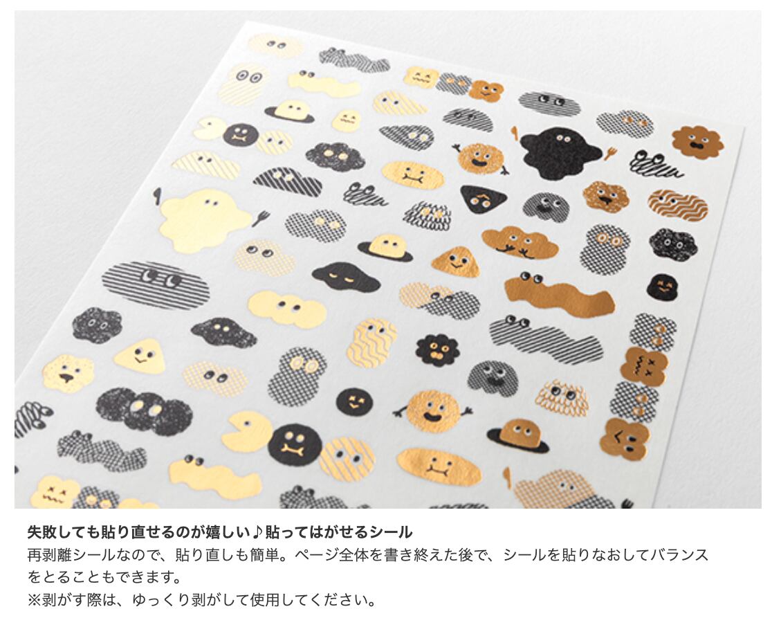 間違ったところに上から貼ってカモフラージュするシールです。修正シールとしてはもちろん、デコレーションシールとしても使いやすいデザインにしています。キラリと光る繊細な金箔がアクセントになります。