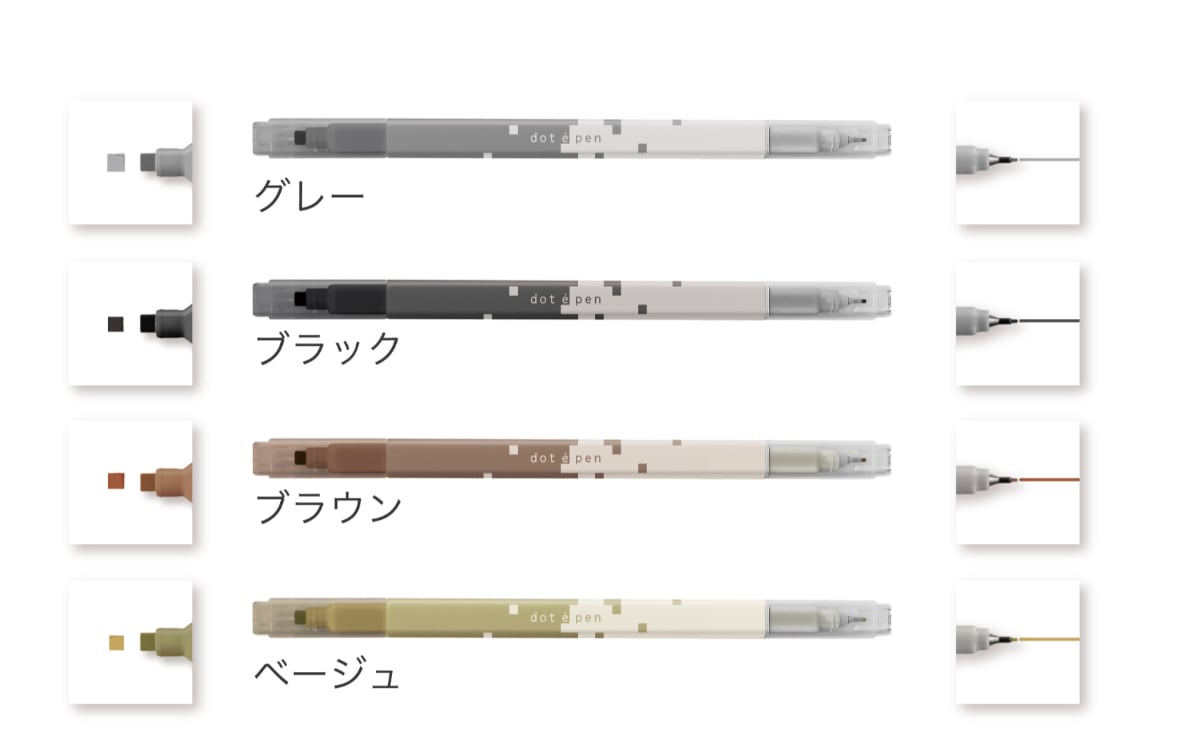 そんな「ドット絵」を手軽に描いて楽しめる『dot e pen(ドット・エ・ペン)』は、カラーバリエーションが豊富な16色展開で、いろいろなドット絵に挑戦できます。インクは滲んで広がりにくいものを、いろいろな紙との相性も考慮し採用。パキッとした発色にもこだわっています。