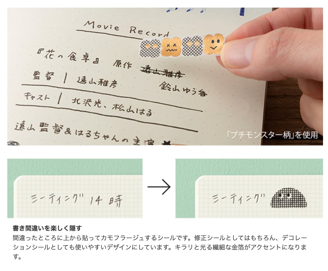 間違ったところに上から貼ってカモフラージュするシールです。修正シールとしてはもちろん、デコレーションシールとしても使いやすいデザインにしています。キラリと光る繊細な金箔がアクセントになります。