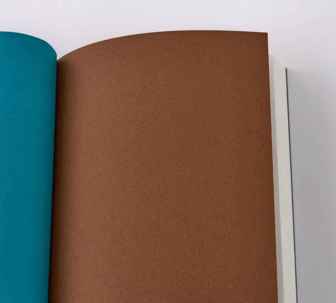 表紙と本文紙を繋ぐ見返しは砂岩のようなテクスチャーで落ち着いた印象のサガンGA ブラウンです。