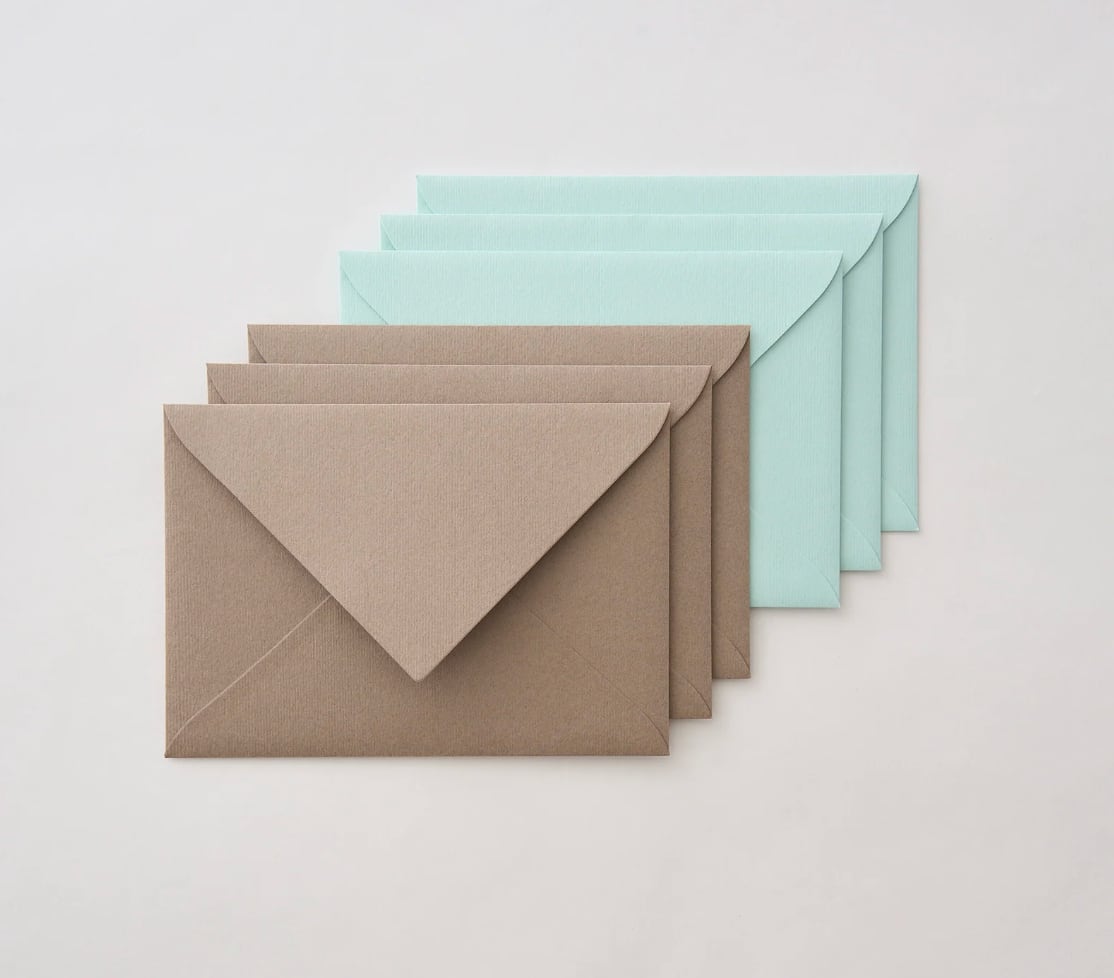 封筒はやわらかいレイド(簀の目模様)であたたかみのある手触りの紙、モフル。お菓子を思わせる色合いの中から、ソルベ、ショコラの2色。