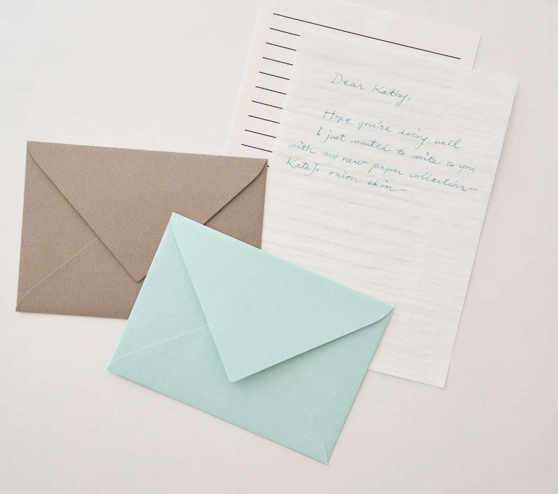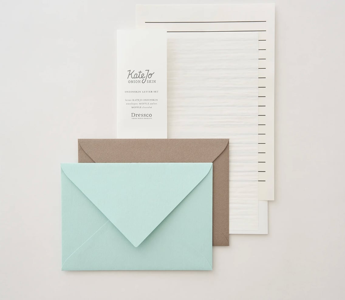 まるで玉ねぎの薄皮のように軽くやわらかく、しわ感のある紙、オニオンスキンペーパーを便箋にしたレターセット。