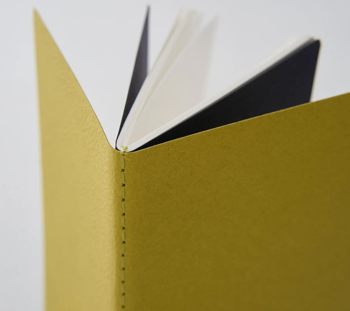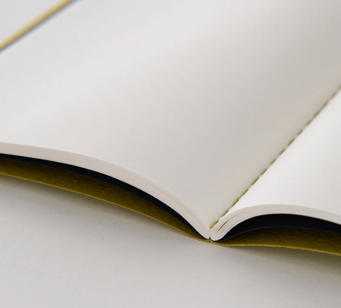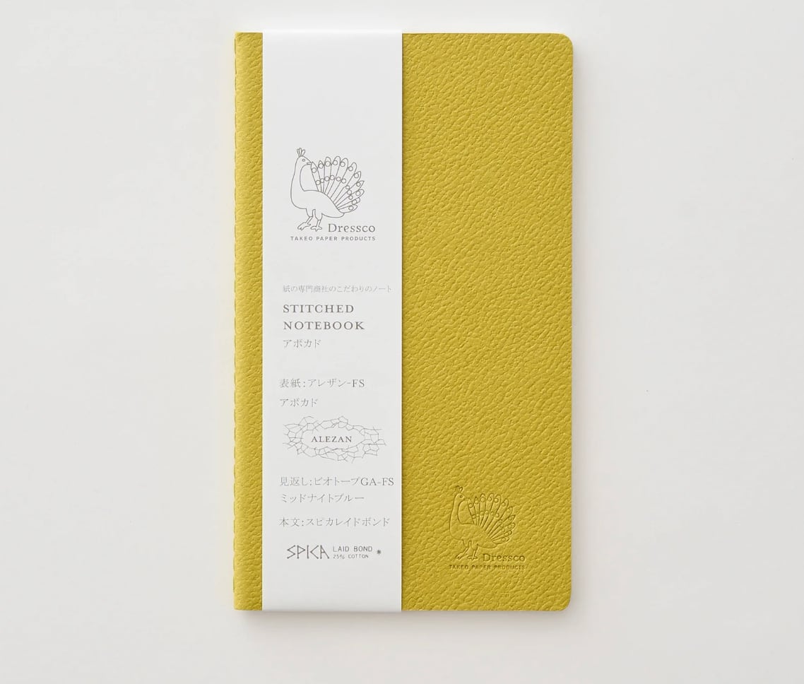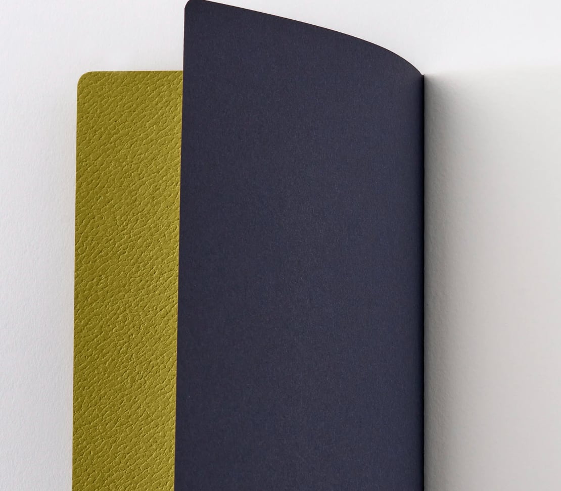 表紙は、しっとりと手になじむ革のような質感の紙、アレザン-FS アボカド、見返しは、深みのある色合いと張りのある触感が特徴のクラフト素材の紙、ビオトープGA-FS ミッドナイトブルーです。