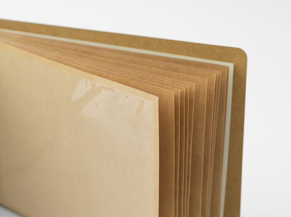 クラフト台紙に貼られた透明シートのポケットに、