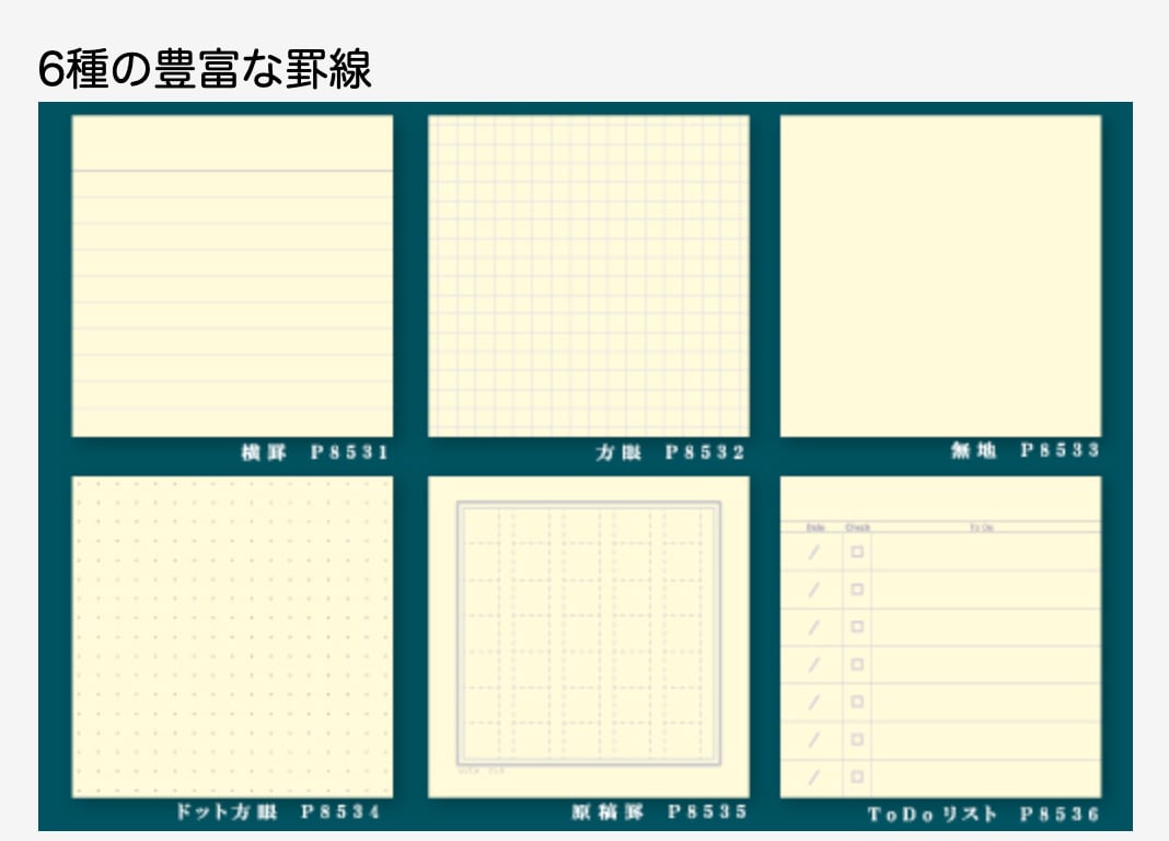 大きすぎずデスクや電話の横に置いたりちょっとしたスペースでも使いやすいサイズ感、厚みは約43㎜です。6種類あります。