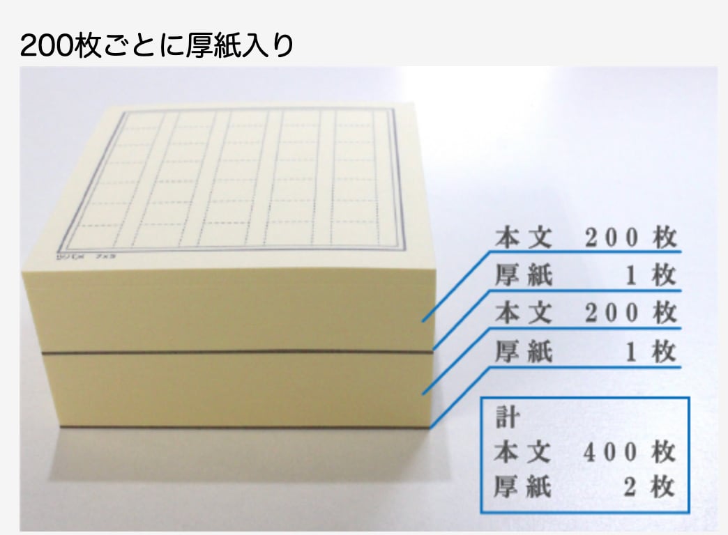 本文枚数は400枚で、200枚ごとに仕切りのボール紙(厚紙)が入っているので耐久性もあり、用途に合わせて半分に切り分けて200枚のブロックメモ2冊として使うこともできます。