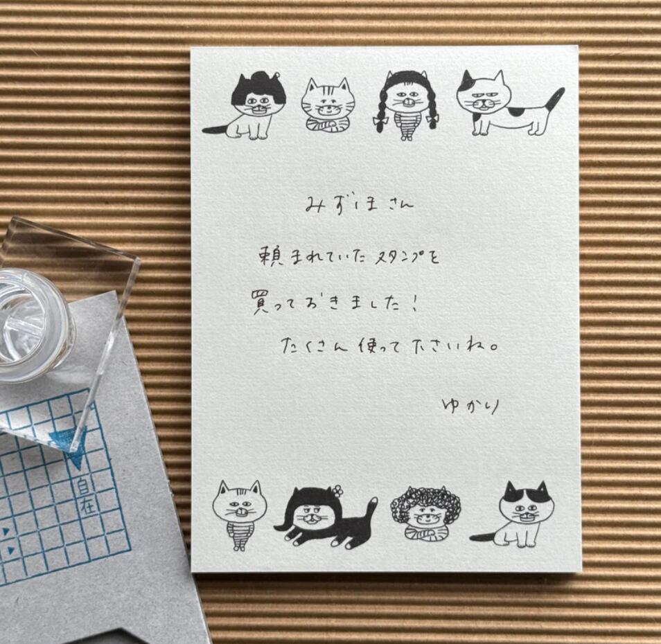 「自在ハンコ ボックス 図案セットカツラねこ」のモチーフを使ったメモパッドです。