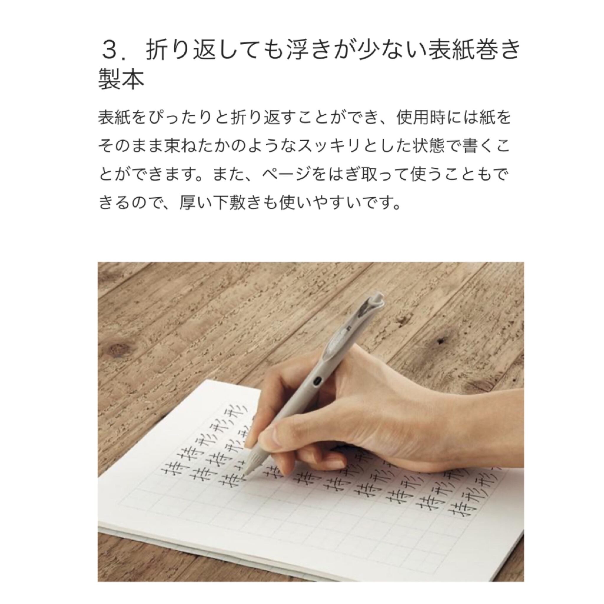 1枚ずつはぎとれる表紙巻き製本なので、厚い下敷きも使いやすい。